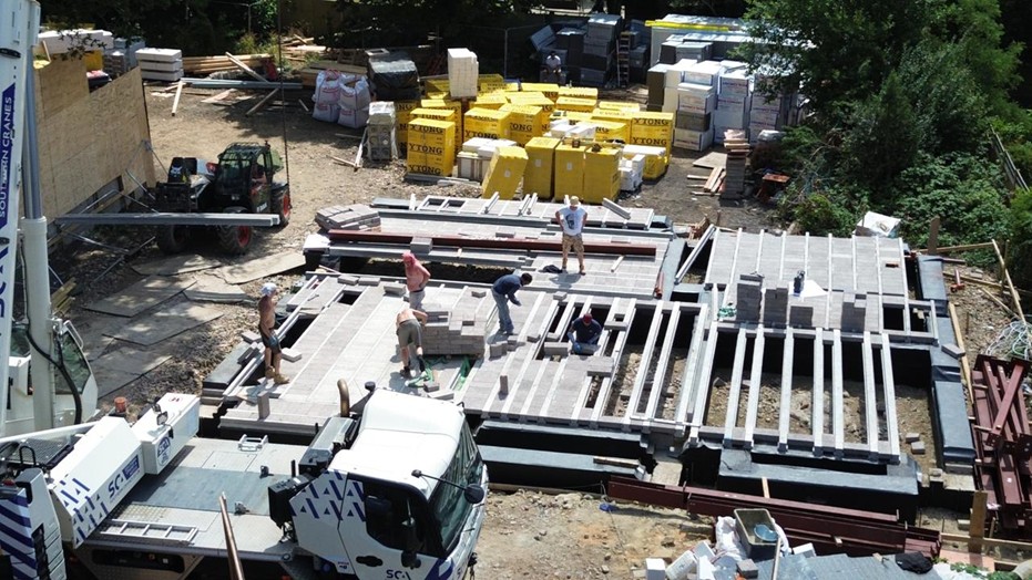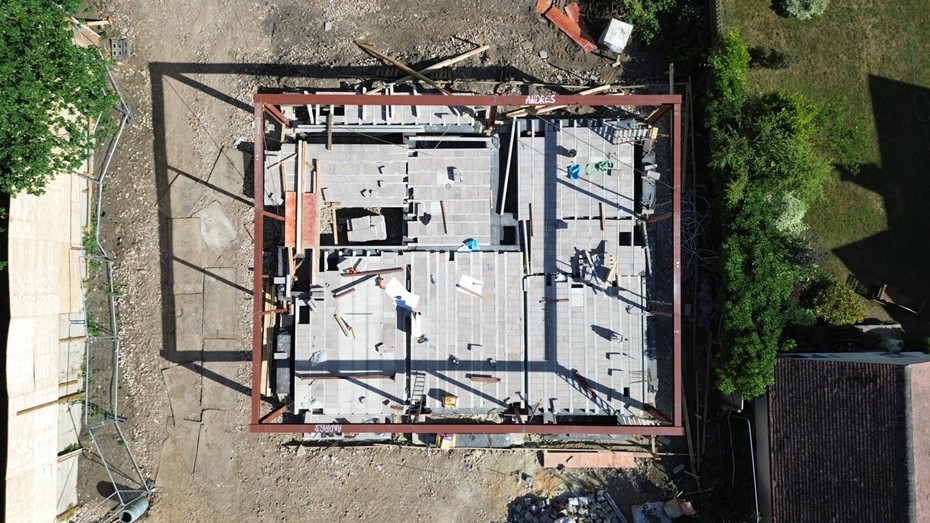 The structure uses precast concrete floors for acoustic separation and Silca/Ytong structural blocks (200×200×380) instead of traditional steel framing — improving comfort, thermal performance, moisture resistance and fire safety.